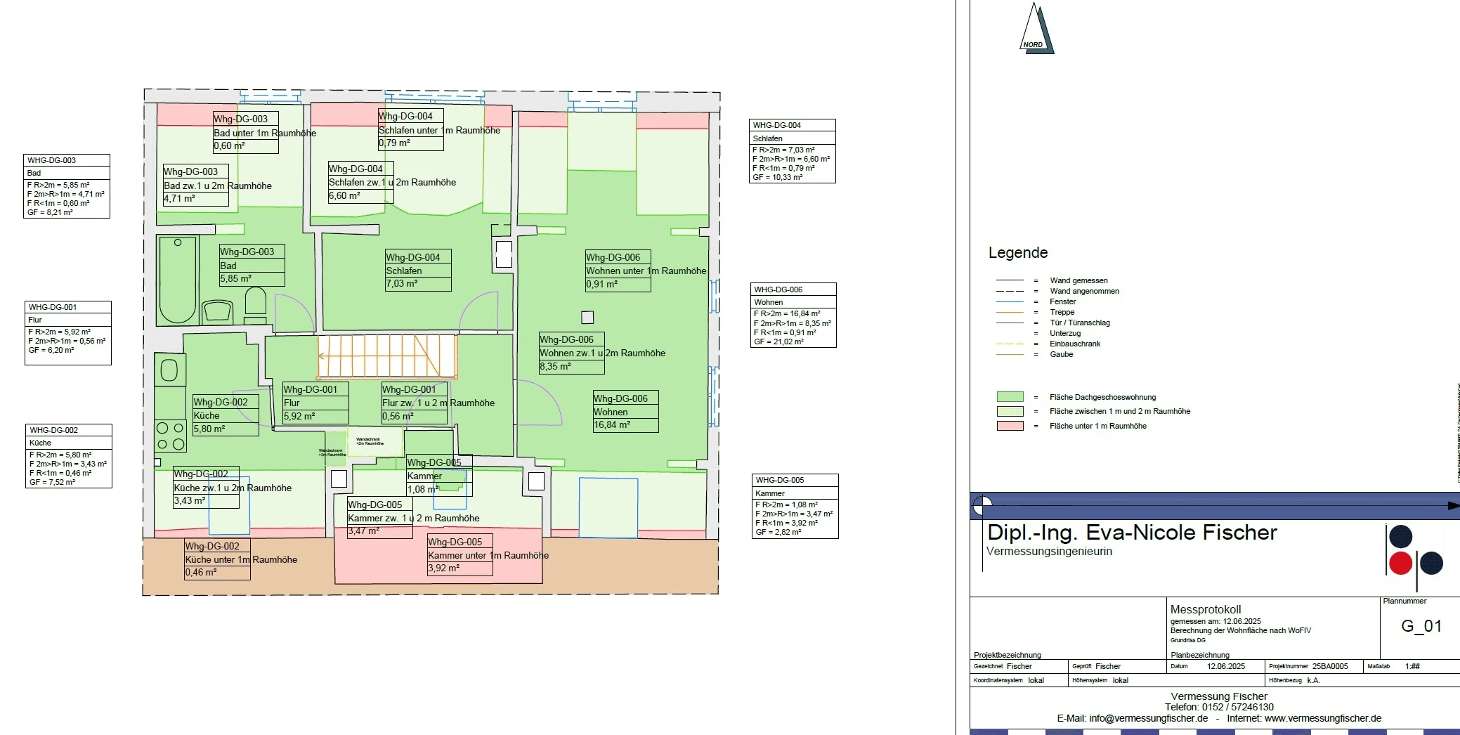 Aus der registrierten und ausgeglichenen Gesamtpunktwolke wurde ein Punktwolkenmodell erstellt. Dieses Modell wurde in ein CAD-Programm eingelesen und daraus konnte dann ein Grundriss gezeichnet werden. Durch die Punktwolke konnte dann die 1m und 2 m Höhenlinie gelegt werden und somit die exakte Raumhöhen und damit der Flächen, insbesondere wegen der Dachneigungen und der Gauben, ermittelt werden. Die Mietfläche wurde in Anlehnung an die WoFlV ermittelt.