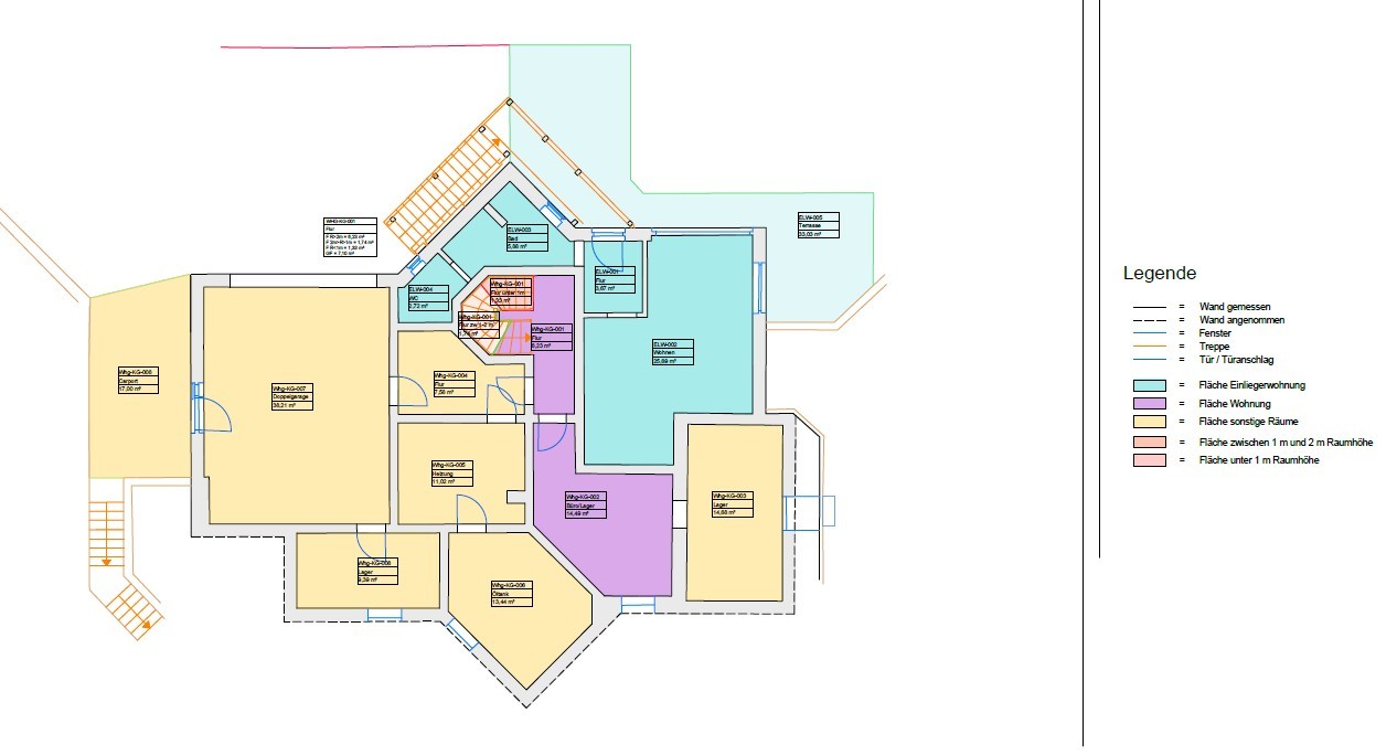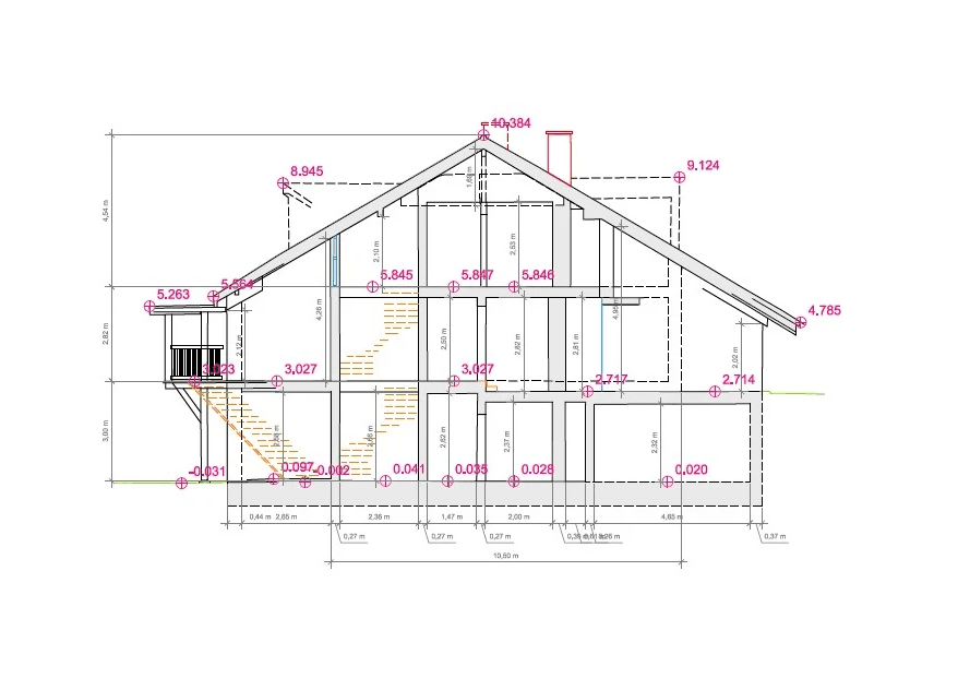 Fünf Stunden Laserscanning-Aufmaß vor Ort; außen in Farbe, um die Außenwände mittels farbigen Orthophotos gut sichtbar zu zeigen. Komplettes Innenaufmaß aller Räume.