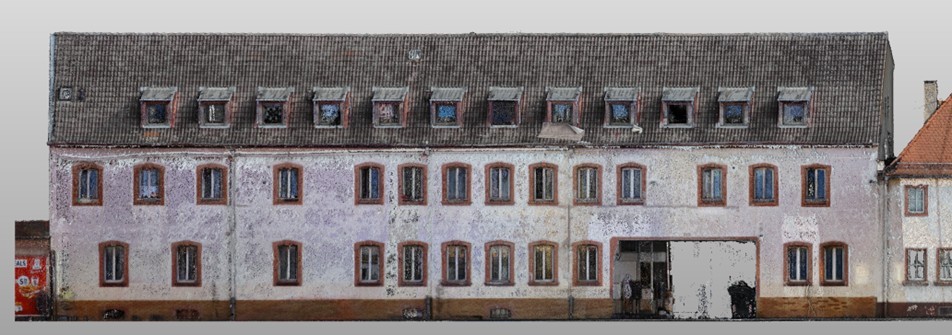 Fünf Tage Laserscanning-Aufmaß vor Ort; außen in Farbe, um die Außenwände mittels farbigen Orthophotos gut sichtbar zu zeigen. Komplettes Innenaufmaß aller Räume.