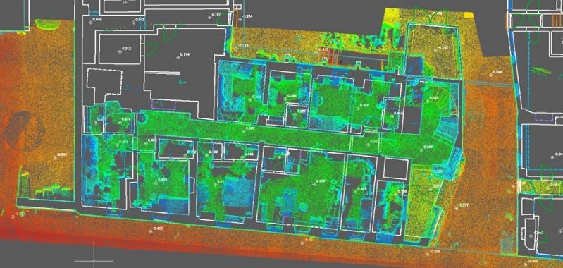 5 Tage Laserscanning-Aufmaß vor Ort; außen in Farbe, um die Außenwände mittels farbigen Orthophotos gut sichtbar zu zeigen. Komplettes Innenaufmaß aller Räume.