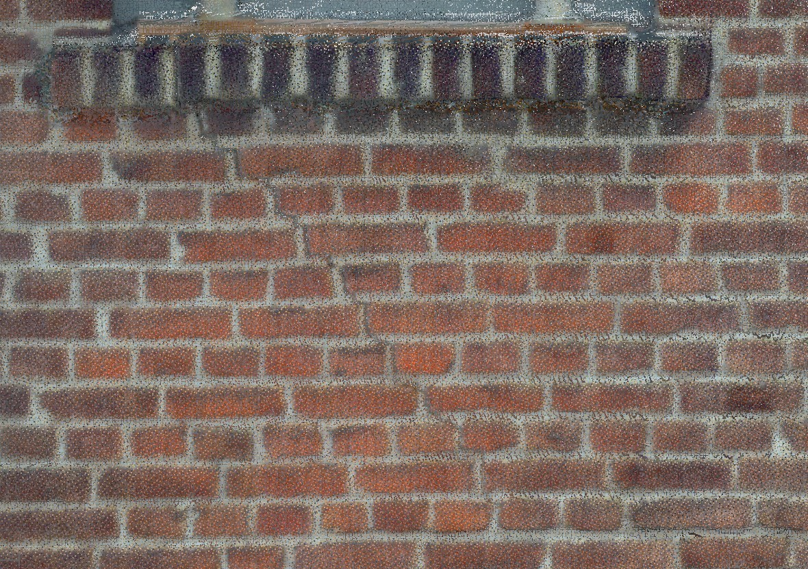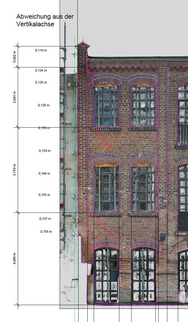 Aus der registrierten und ausgeglichenen Gesamtpunktwolke wurde ein Punktwolkenmodell erstellt. Mit Hilfe der erhaltenen Drohnendaten konnte auch in größerer Höhe ausreichend Messpunkte erhalten werden. Aus diesem Modell wurden präzise Orthophotos erstellt in ein CAD-Programm eingelesen. Mit Hilfe der Orthophotos konnte die geneigte Außenkante des Backsteingebäudes nachgezeichnet werden und einer vertikalen Achse gegenübergestellt werden. Erkennbare Risse wurden ebenfalls eingezeichnet.